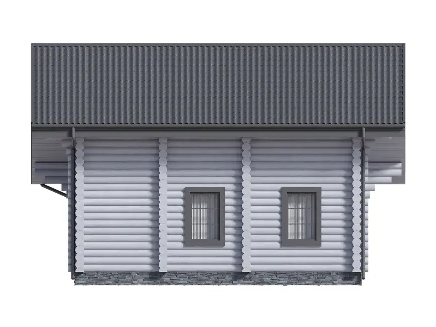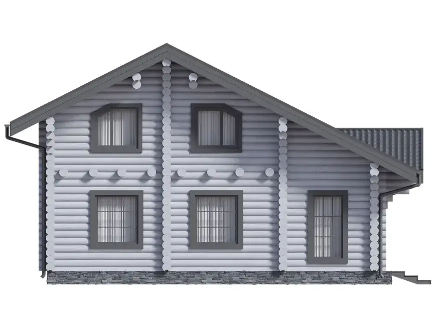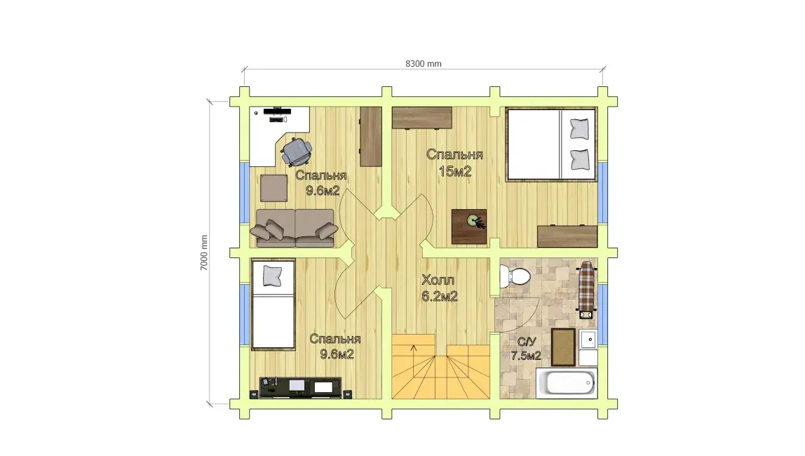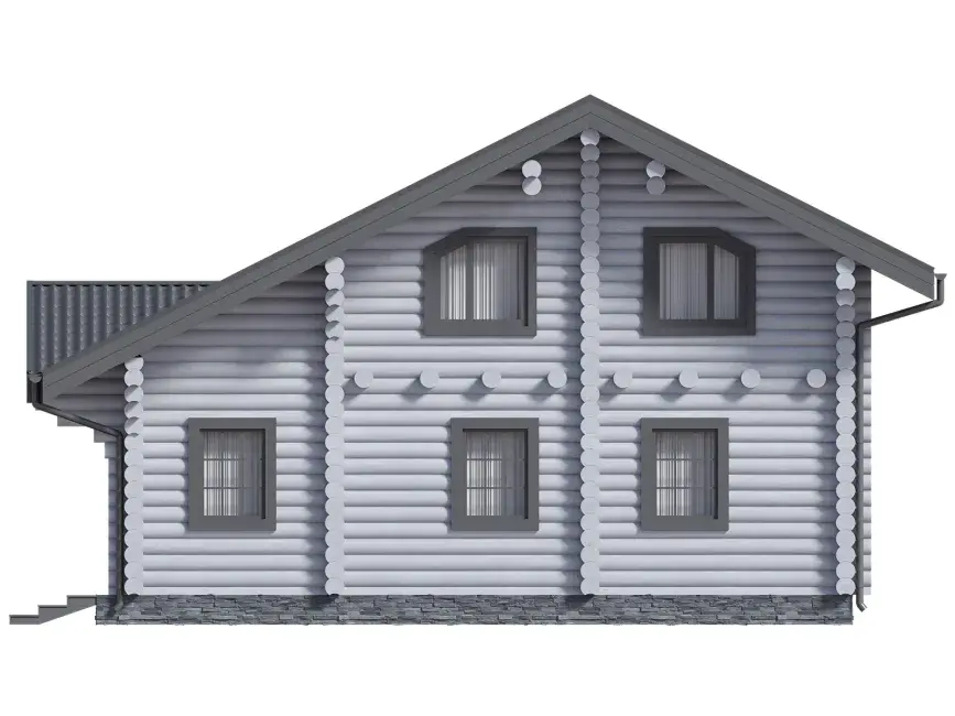 Мансардный этаж сруба поднят аттиковой боковой стеной на 1,5м. На мансардном этаже три спальни: две из них по 9,85м2, одна спальня 15м2 и санузел мансарды.