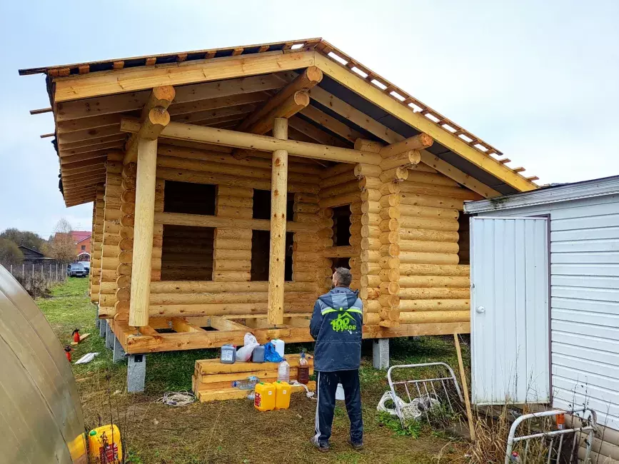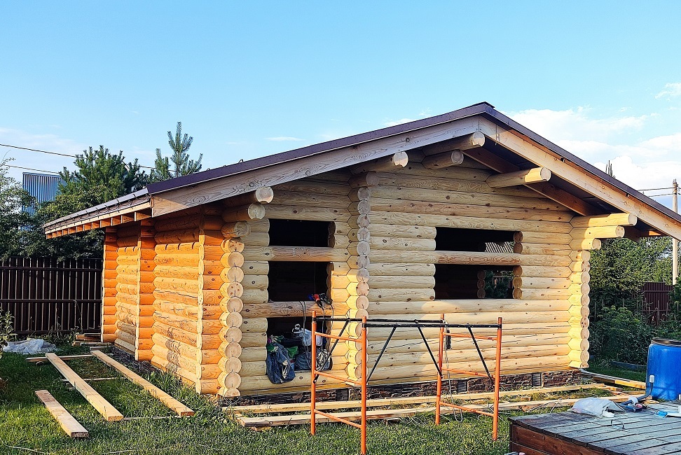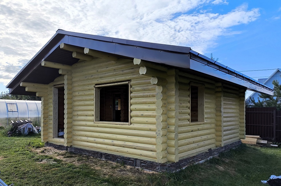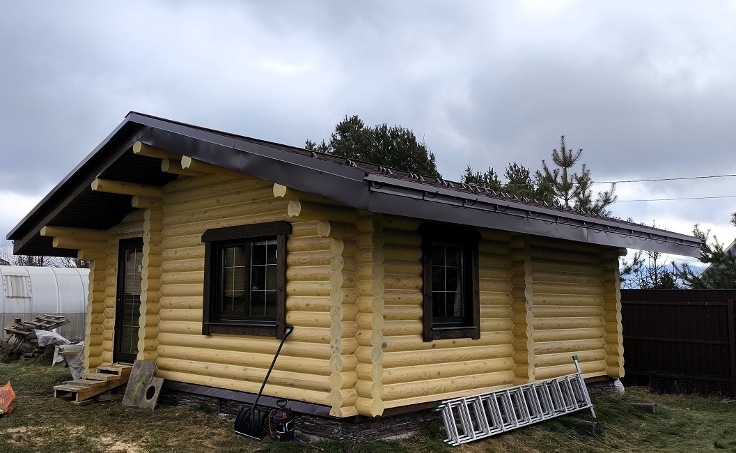Внешняя отделка бани, построенной в июле 2023 года: шлифовка, покраска, герметик теплый шов, подшив свесов.