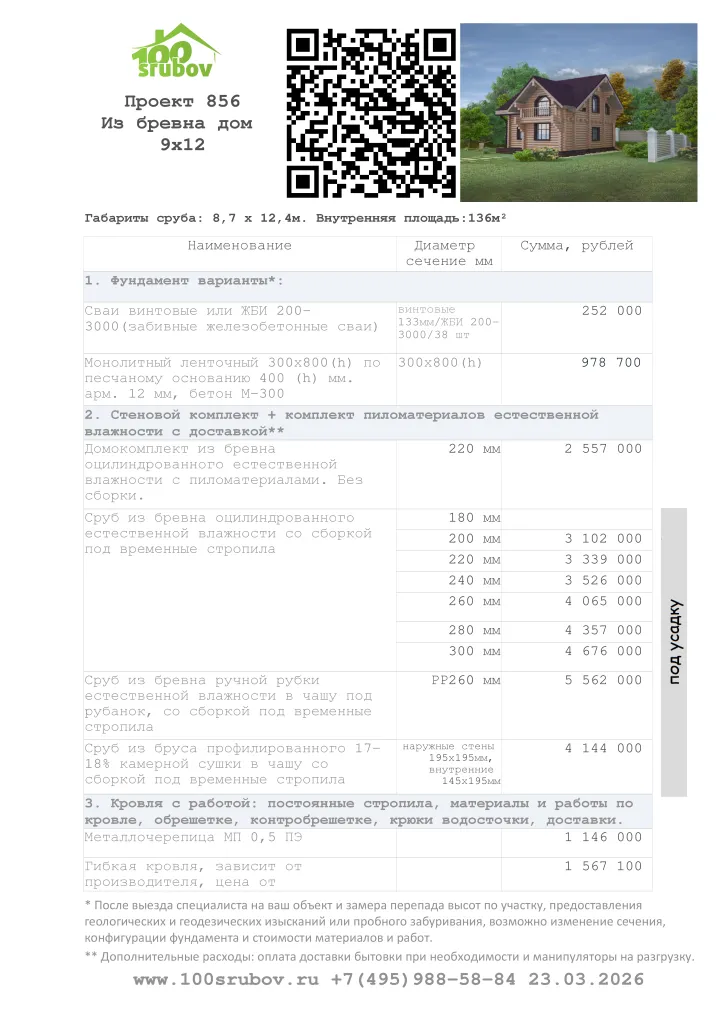 Комплектация строительства по проекту #856: стеновой комплект, в комплект пиломатериалов входит: балки перекрытий 100х200, черновой пол бруски и доска 25х150, стропильная система 50х200, обрешетка 25х150, бруски 50х50 со сборкой, фундамент и кровля на выбор. Есть варианты собрать сруб под временную кровлю либо под металлочерепицу с гидроизоляцией.