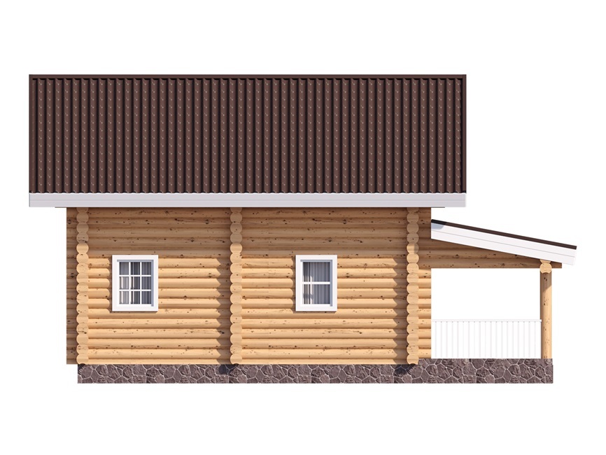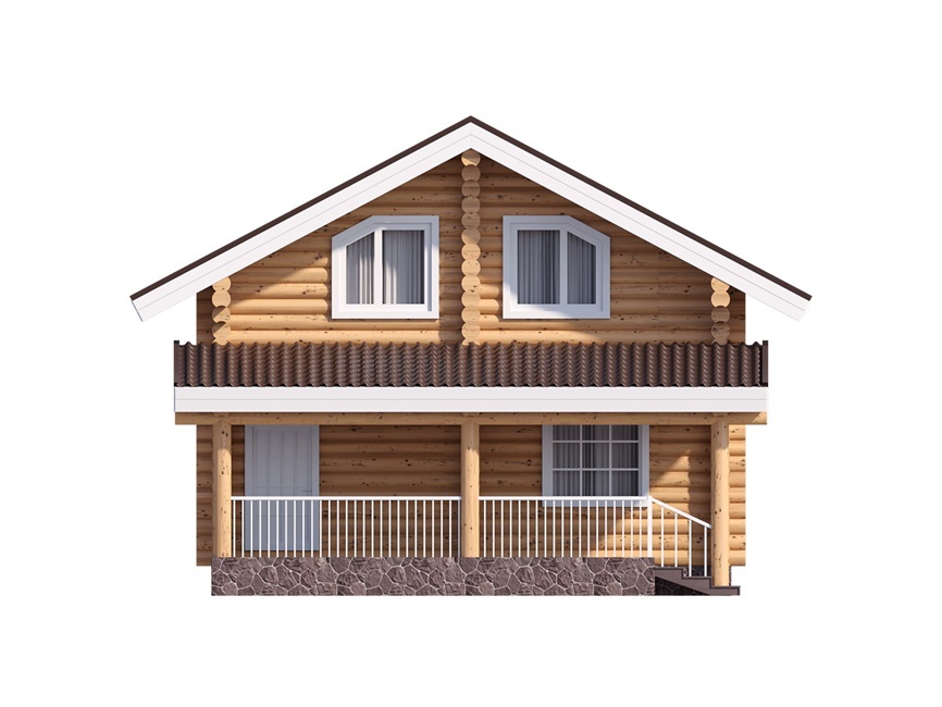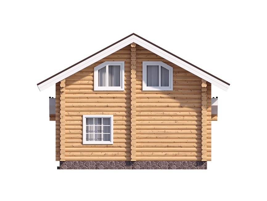 Скромный внешний вид этого двухэтажного дома 7 на 10 в осях для постоянного проживания не умаляет его достоинств, но подчеркивает практичность. Никакой вычурности, мелких деталей или нагромождения элементов. Все просто, аккуратно и достойно. Однако этот сруб не выглядит скучной шаблонной постройкой, поскольку выполнен из качественного оцилиндрованного бревна солнечного цвета, который отлично впишется в любой пейзаж – будь то снежная зима или ярко-зеленое лето.