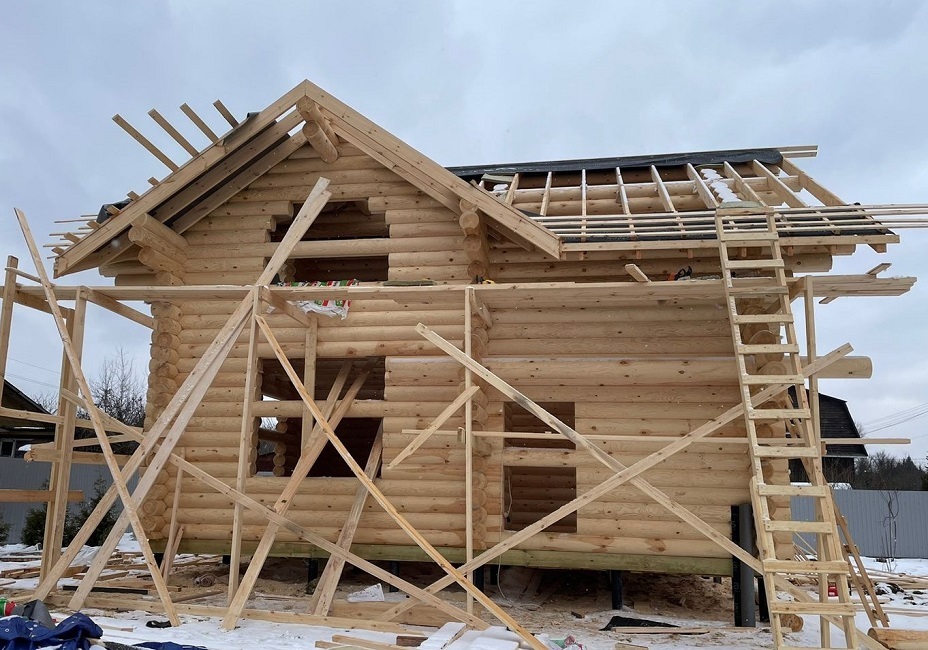 в марте 2021 года собрали сруб под постоянные стропила, в июле монтаж гибкой кровли.