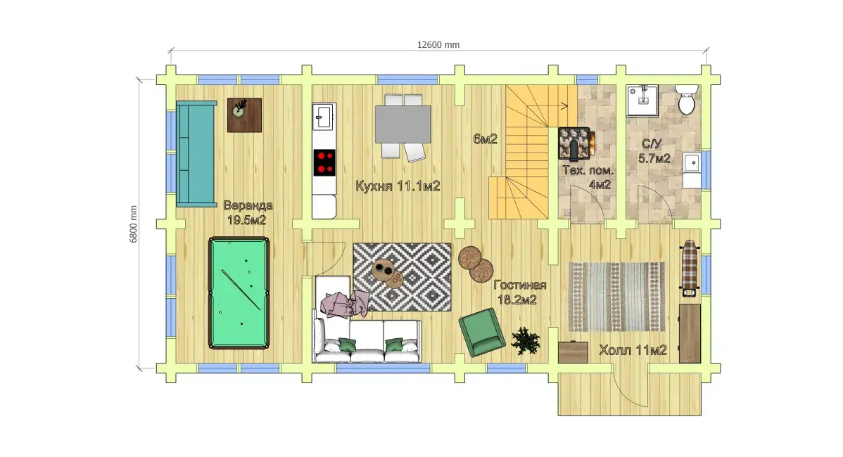 На первом этаже сруба расположены гостиная, кухня, тех. помещение, блок ванной и санузла, веранда. Первый этаж дома с мансардой предназначен для семейных встреч и гостей,