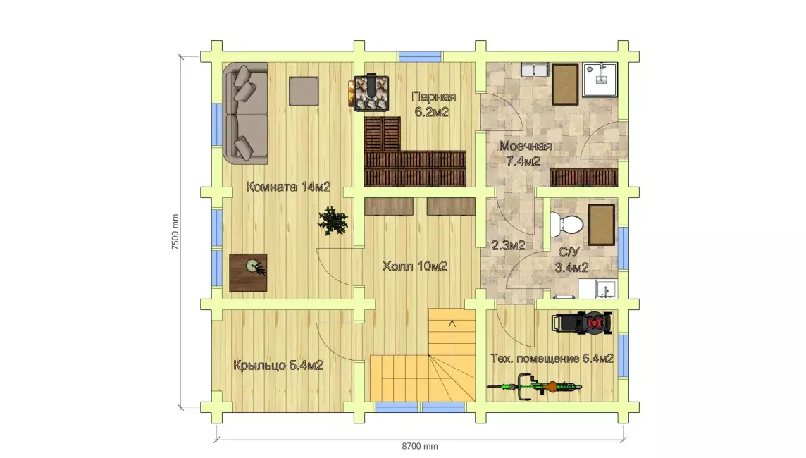 На первом этаже бани располагаются просторная комната отдыха, парная и моечная, техпомещение и отдельный санузел.