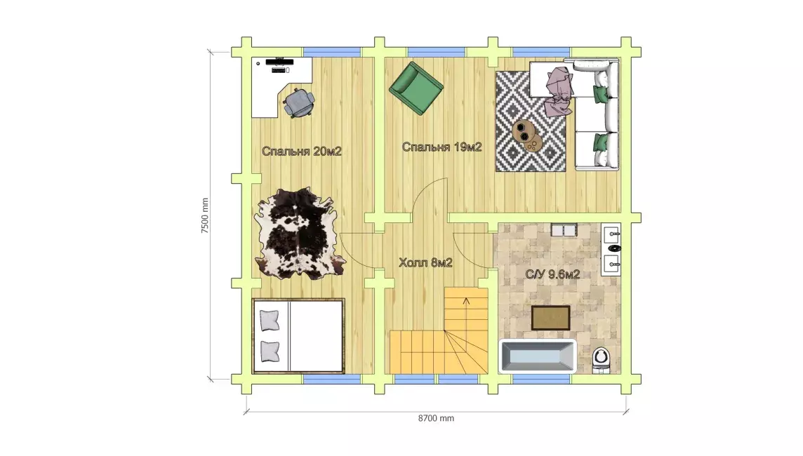Поднявшись по лестнице из холла, вы попадаете в две просторные спальни, расположенные на мансарде и отдельный санузел. Особенность мансарды таких срубов - высота боковой аттиковой стены 1,4 метра.